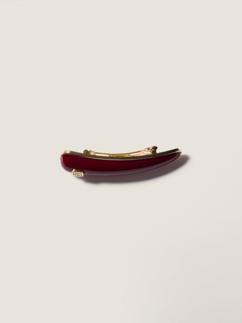 The iconic Miu Miu metal logo adds a contemporary accent to this patent leather hair clip, completing each look with a touch of strong and sophisticated femininity. - Product code: 5IF240_069_F0D27 - Metal clip on the back - Visible metal logo - Imported Height 1.5cm Width 8cm Materials Main material: Lambskin
