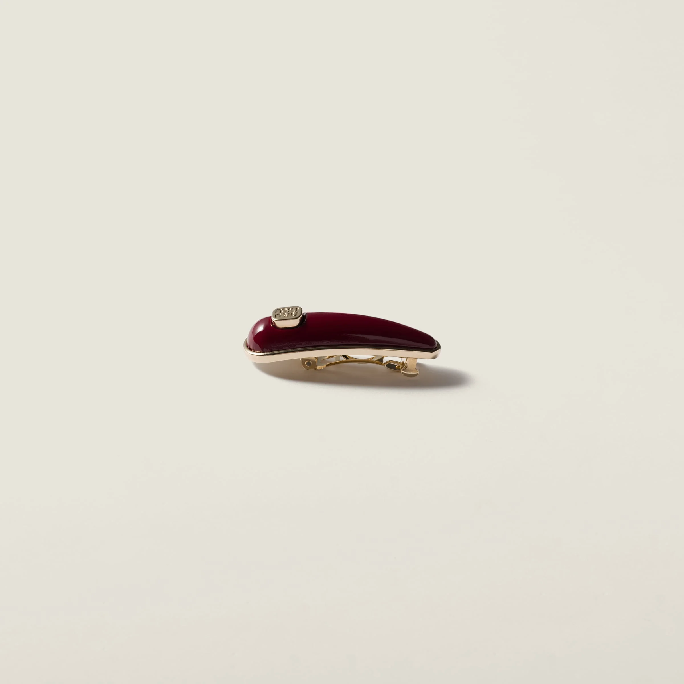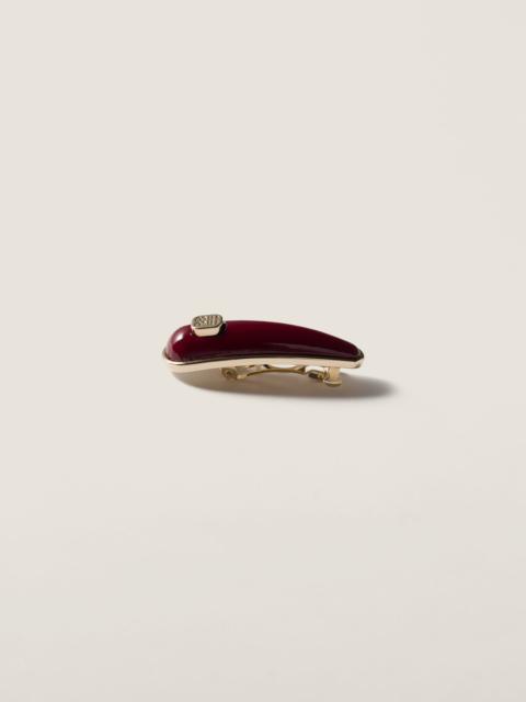 The iconic Miu Miu metal logo adds a contemporary accent to this patent leather hair clip, completing each look with a touch of strong and sophisticated femininity. - Product code: 5IF241_069_F0D27 - With metal trim - Visible metal logo - Imported Height 1.7cm Width 5.2cm Materials Main material: Lambskin