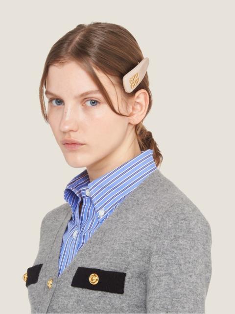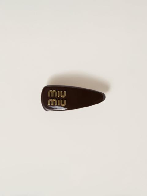 The iconic Miu Miu logo stands out on this patent leather hair clip. - Product code: 5IF092_069_F0002 - Metal lettering logo - Imported Height 3cm Width 8cm Materials Main material: Lambskin