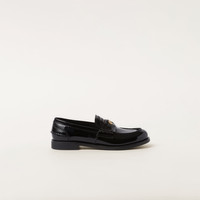 In the 1950s, loafers were part of the uniform worn by American college students. Opposed to wearing a uniform, students started inserting a penny in the slot on the leather strap, which originated the name "penny loafer." This timeless footwear synonymous with tradition is reimagined by Miu Miu in the new collection in a bolder version. - Product code: 5D773D_XWH_F0002_F_020 - Apron with leather strap and metal ornament - Leather lining - Embossed logo on the tongue - Rubber sole - 20 mm heel - Leather insole - Imported