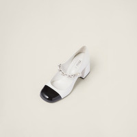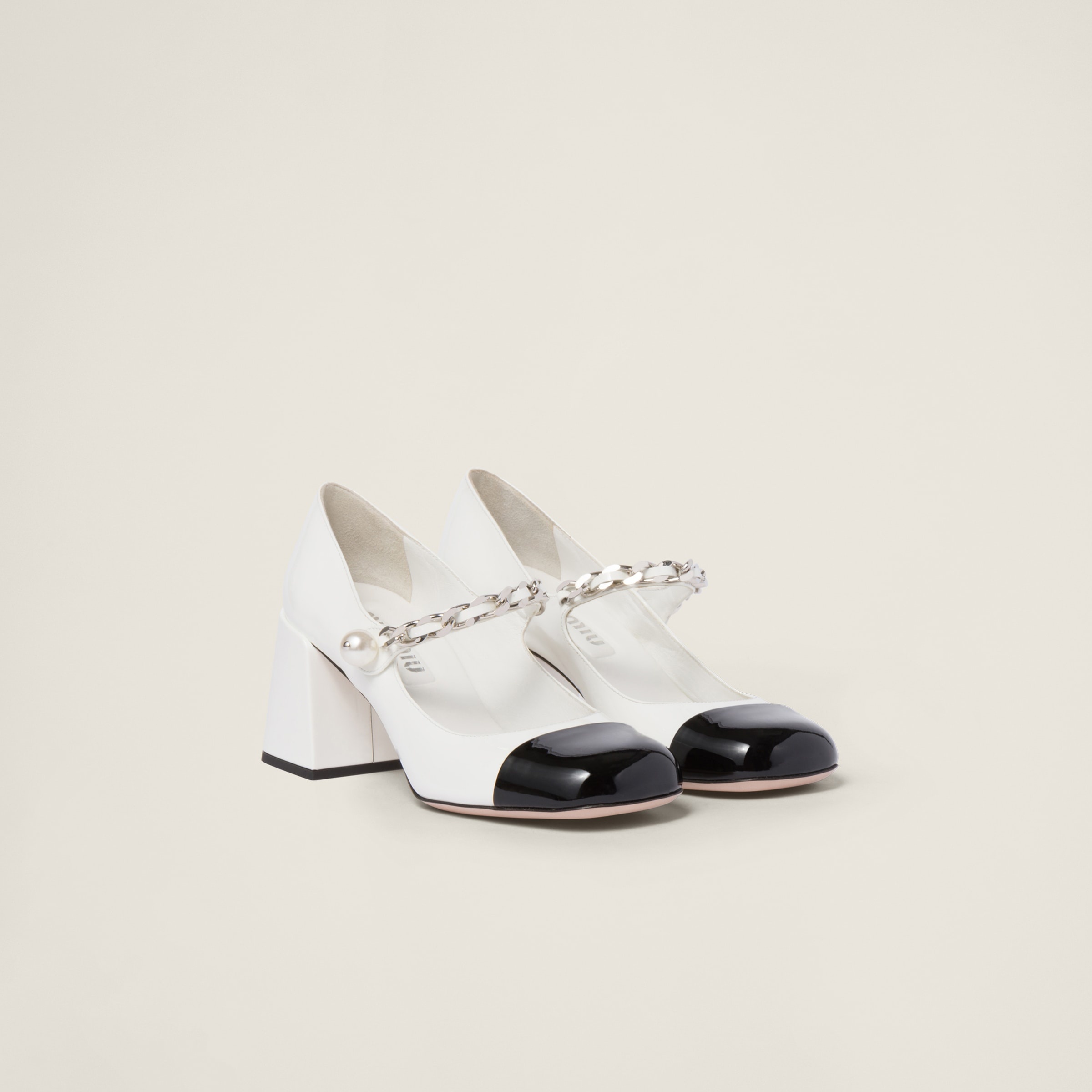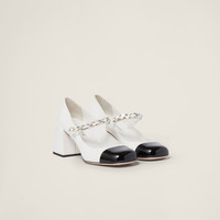 A romantic design and refined details define these patent leather pumps. The instep strap with metal chain and pearl on the closure accent the shoe, recalling the jewelry world. The color contrast between the toe and upper stands out. - Product code: 5I248D_ZHV_F0964_F_M065 - Upper with metal chain and artificial pearl - Fabric logo label - Leather sole - 65 mm patent leather covered heel - Imported Materials Main material: Calfskin