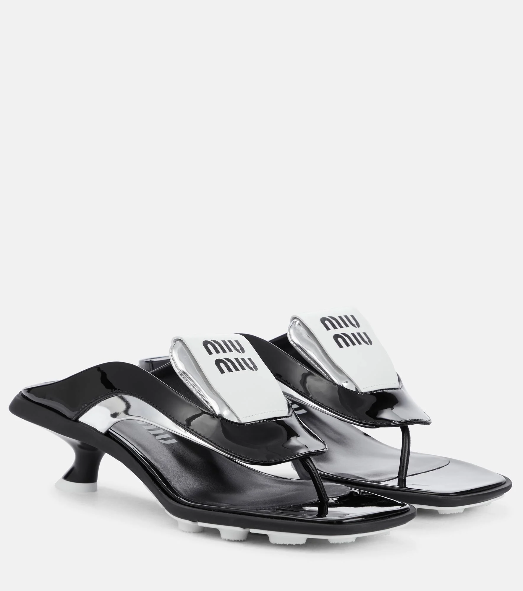 Slip into something resembling future-facing footwear, courtesy of these Miu Miu sandals. A hybrid design with patent leather thong straps and metallic silver-tone accents, they have tapered kitten heels and logo-stamped tongues. You'll find them even more enticing, thanks to the rubber soles with added pads for cushioning and grip. Product Details - Lining: leather - Sole: leather insole, rubber sole - Upper: calf leather - Toe shape: square open toe - Made in Italy - Designer color name: Nero + Argento - Item number: P00562298 Size & Fit - True to size - For narrow feet, we recommend trying a half size smaller - Slightly wide - European sizes - 6cm-2.5" heel (size EU 38)