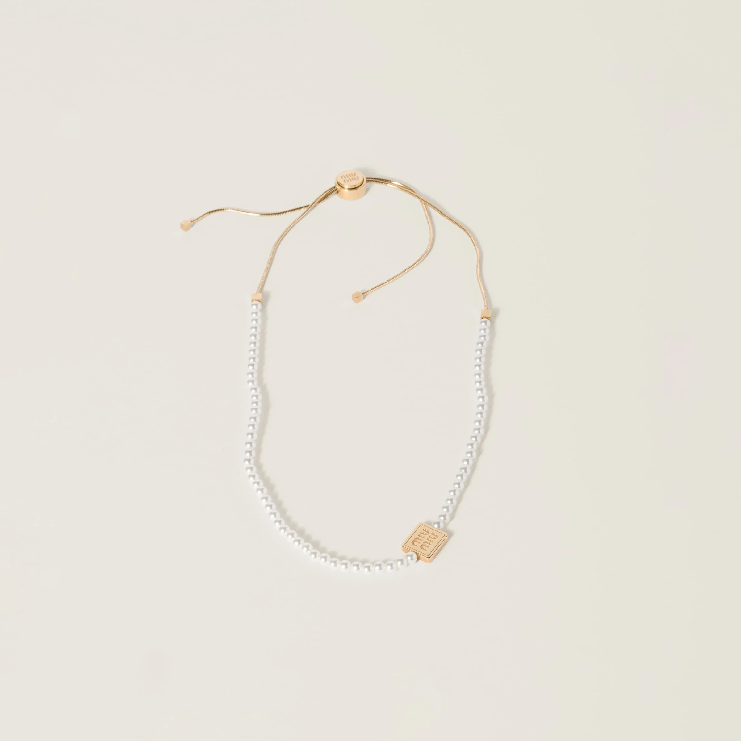 This choker, characterized by a string of elegant pearls and the metal logo, reflects the bold encounter between vintage and contemporary references of Miu Miu style. - Product code: 5IC066_2CVA_F0SAJ - With synthetic pearls - Adjustable drawstring closure - With metal logo detail - Logo on clasp - One size fits all - Imported Width 40cm Materials Other materials