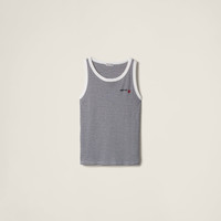 The collaboration between Petit Bateau and Miu Miu has inspired an elegant and playful kidswear wardrobe. The timeless stripe motif characterizing this slim-fit top celebrates the texture of ribbed jersey enriched with iconic embroidered logos. - Product code: MJT704_161J_F0UB0_S_OOO - Slim-fit silhouette - Embroidered logos - Imported - The model is 178 cm tall and wears a size 38 Height 59cm Materials Main material: 100% Cotton