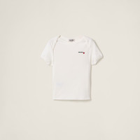 The Petit Bateau X Miu Miu collaboration is inspired by simple and authentic childrenswear. White, a symbol of pure elegance, elevates the fine workmanship of this soft cotton tee decorated with delicate picot trim and enriched with iconic embroidered logos. - Product code: MJN563_16J8_F0009_S_OOO - Slim-fit silhouette - Crew-neck - Short sleeves - Twin-needle hem - Embroidered logos - Imported Height 45cm Materials Main material: 93% Cotton 7% Elastane