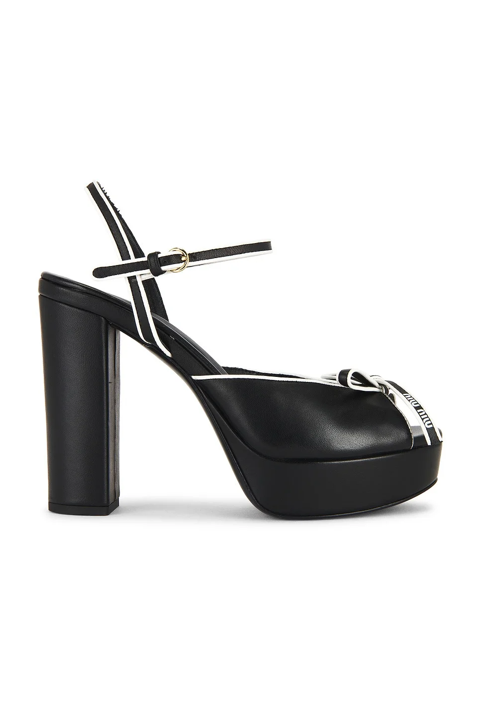 Details - Nappa upper with leather sole - Ankle buckle closure - Leather footbed and lining - Almond toe - Stiletto heel - Approx 25mm/ 1 inch platform - Approx 100mm/ 4 inch heel - This item is not available for international export - Made in Italy - Our Style No. MIUF-WZ208 - Manufacturer Style No. 5XP909-F110