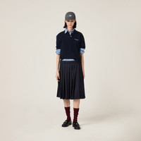 The checked poplin boxer shorts detail of this midi-skirt is combined with batavia fabric, enhancing the pleated lines and playing with the juxtaposition of menswear and womenswear elements in the Miu Miu wardrobe. - Product code: MG2396_11AD_F0008_S_OOO - Unlined garment - Side zipper closure with hook - Lettering logo - Imported - The model is 180 cm tall and wears a size 38 Height 63cm Materials Main material: 100% Virgin Wool