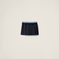 The checked poplin boxer shorts detail of this miniskirt is combined with batavia fabric, enhancing the pleated lines and playing with the juxtaposition of menswear and womenswear elements in the Miu Miu wardrobe. - Product code: MG2388_11AD_F0008_S_OOO - Mini silhouette - Unlined garment - Side zipper closure with hook - Lettering logo - Imported Height 34cm Materials Main material: 100% Virgin Wool