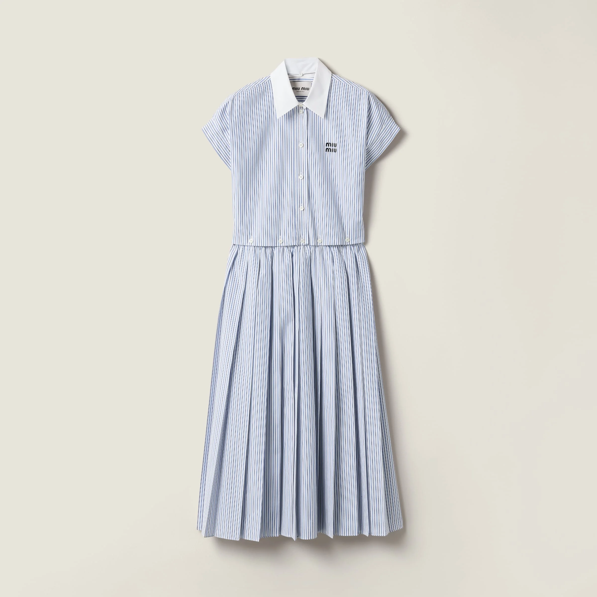Menswear inspiration meets the feminine lines of this poplin dress. The removable collar and cuffs in a contrasting color become distinctive styling details enriched by a classic stripe motif, an emblem of Miu Miu style. - Product code: MF5989_174T_F0W3B_S_OOO - Fit and flare - Unlined - Short sleeves - Shirt collar - Embroidered logo - Imported - The model is 177 cm tall and wears a size 38 Materials Main material: 100% Cotton