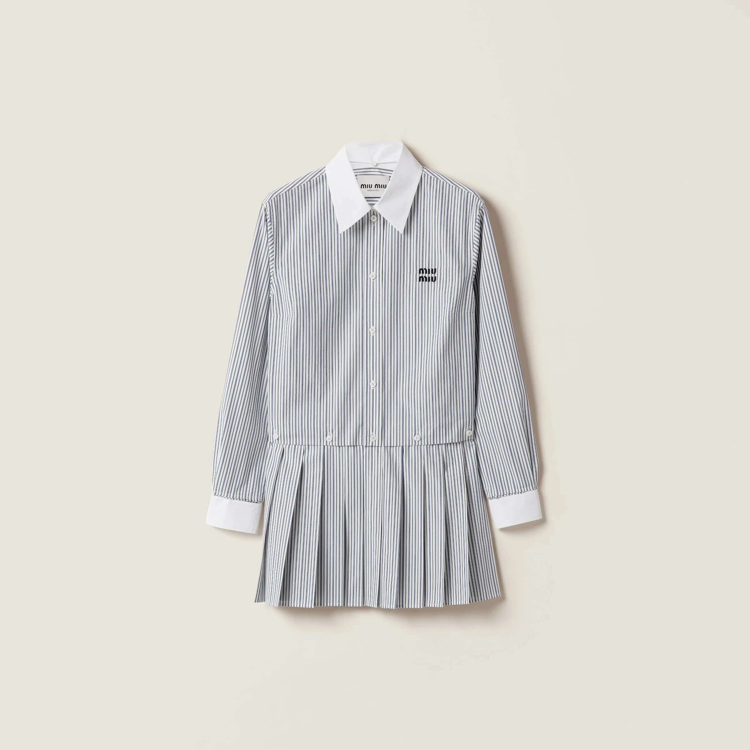 Menswear inspiration meets the feminine lines of this poplin mini-dress. The removable collar and cuffs in a contrasting color become distinctive styling details enriched by a classic stripe motif, an emblem of Miu Miu style. - Product code: MF5988_174T_F0UB0_S_OOO - Loose fit - Unlined garment - Long sleeves - Shirt collar - Embroidered logo - Imported - The model is 180 cm tall and wears a size 38 Height 80cm Materials Main material: 100% Cotton