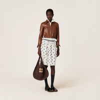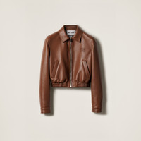 Soft nappa leather is bonded with Miu Miu's iconic jersey to create a garment with refined quality that expresses carefree, rebellious charm symbolized by raw-cut details and a casual fit. - Product code: MPV946_17NH_F0BW5_S_OOO - Jersey-bonded garment - Front zipper closure - Shirt-style collar - Straight sleeves with shirt cuffs - Wide welt pockets - Elasticized hem - Embossed lettering logo - Imported - The model is 180 cm tall and wears a size 38 Materials Main material: Lambskin