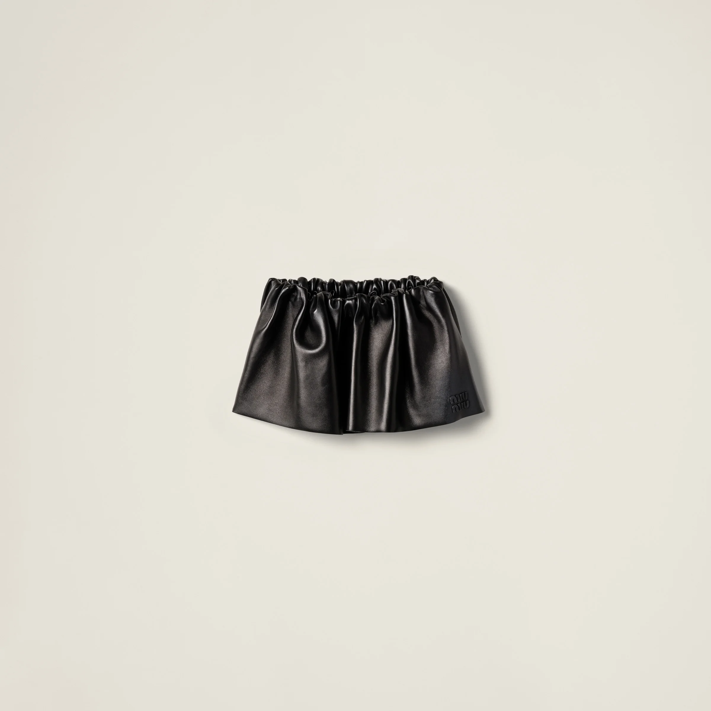 Soft nappa leather is bonded with Miu Miu's iconic jersey to create a garment with refined quality that expresses carefree, rebellious charm symbolized by raw-cut details and a casual fit. - Product code: MPD813_17NH_F0002_S_OOO - Jersey-bonded garment - Regular fit - Unlined garment - Inseam pockets - Elasticized drawstring waistband - Embossed lettering logo - Imported - The model is 178 cm tall and wears a size 38 Height 26cm Materials Main material: Lambskin