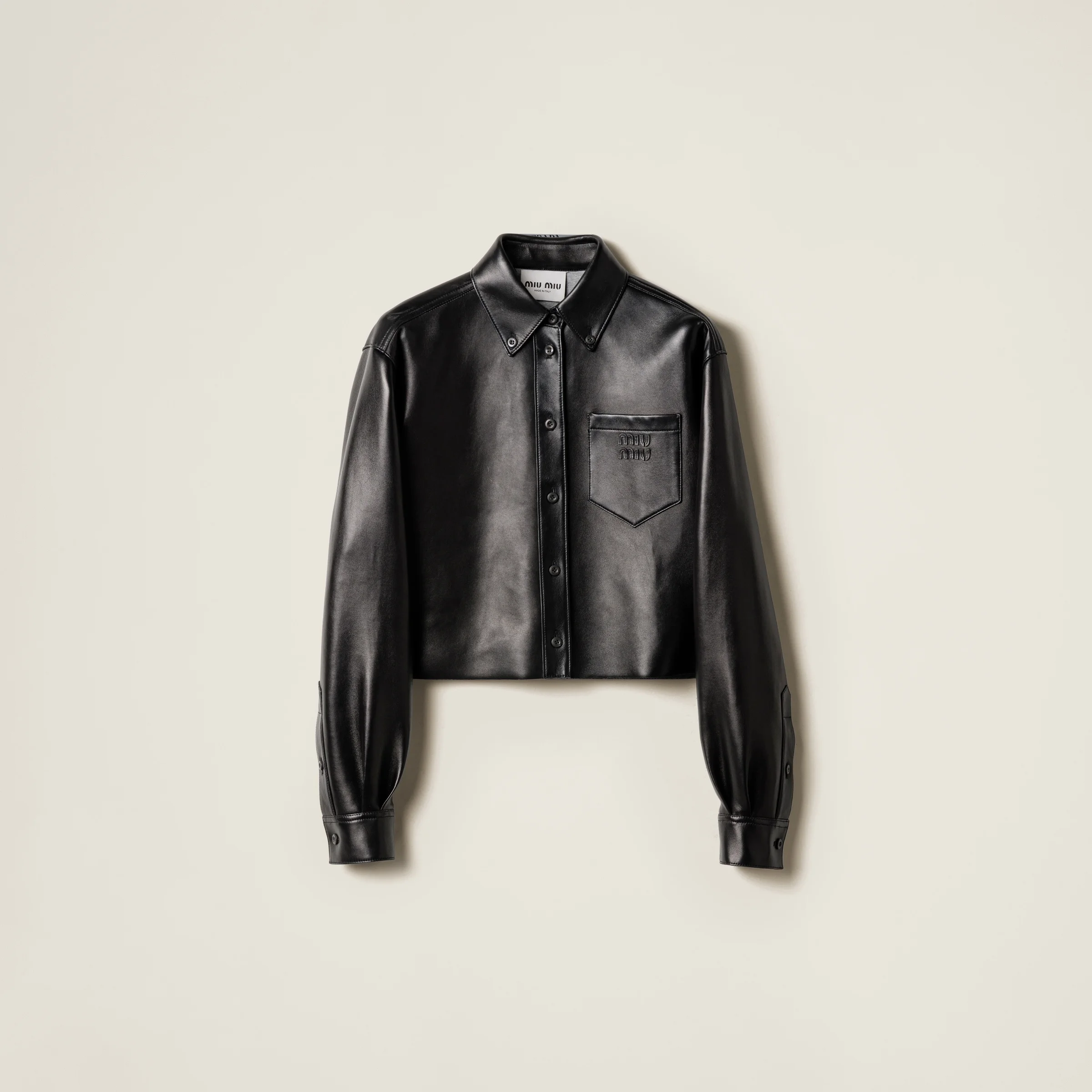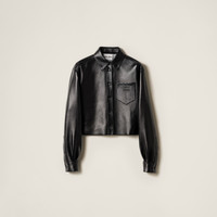 Soft nappa leather is bonded with Miu Miu's iconic jersey to create a garment with refined quality that expresses carefree, rebellious charm symbolized by raw-cut details and a casual fit. - Product code: MPC200_17NH_F0002_S_OOO - Jersey-bonded garment - Regular fit - Shirt collar - Mother-of-pearl front button closure - Straight sleeves with shirt cuffs - Patch pocket on the chest - Embossed lettering logo - Imported - The model is 178 cm tall and wears a size 38 Materials Main material: Lambskin