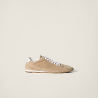 Refined workmanship and materials meet the sleek and extremely light design in these new Miu Miu suede sneakers. The logo stands out on the tongue and on the back thanks to its iconic character. - Product code: 5E114E_054_F0F24_F_005 - Upper with perforated detail - Leather lining - Screen-printed logo on the tongue and heel - Closure with flat laces - Rubber sole - Patterned tread - Removable leather-covered insole - Imported Materials Main material: Calfskin