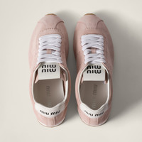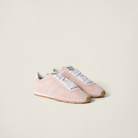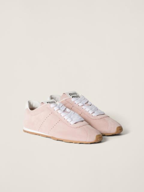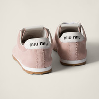 Refined workmanship and materials meet the sleek and extremely light design in these new Miu Miu suede sneakers. The logo stands out on the tongue and on the back thanks to its iconic character. - Product code: 5E114E_054_F0615_F_005 - Upper with perforated detail - Leather lining - Screen-printed logo on the tongue and heel - Closure with flat laces - Rubber sole - Patterned tread - Removable leather-covered insole - Imported Materials Main material: Calfskin