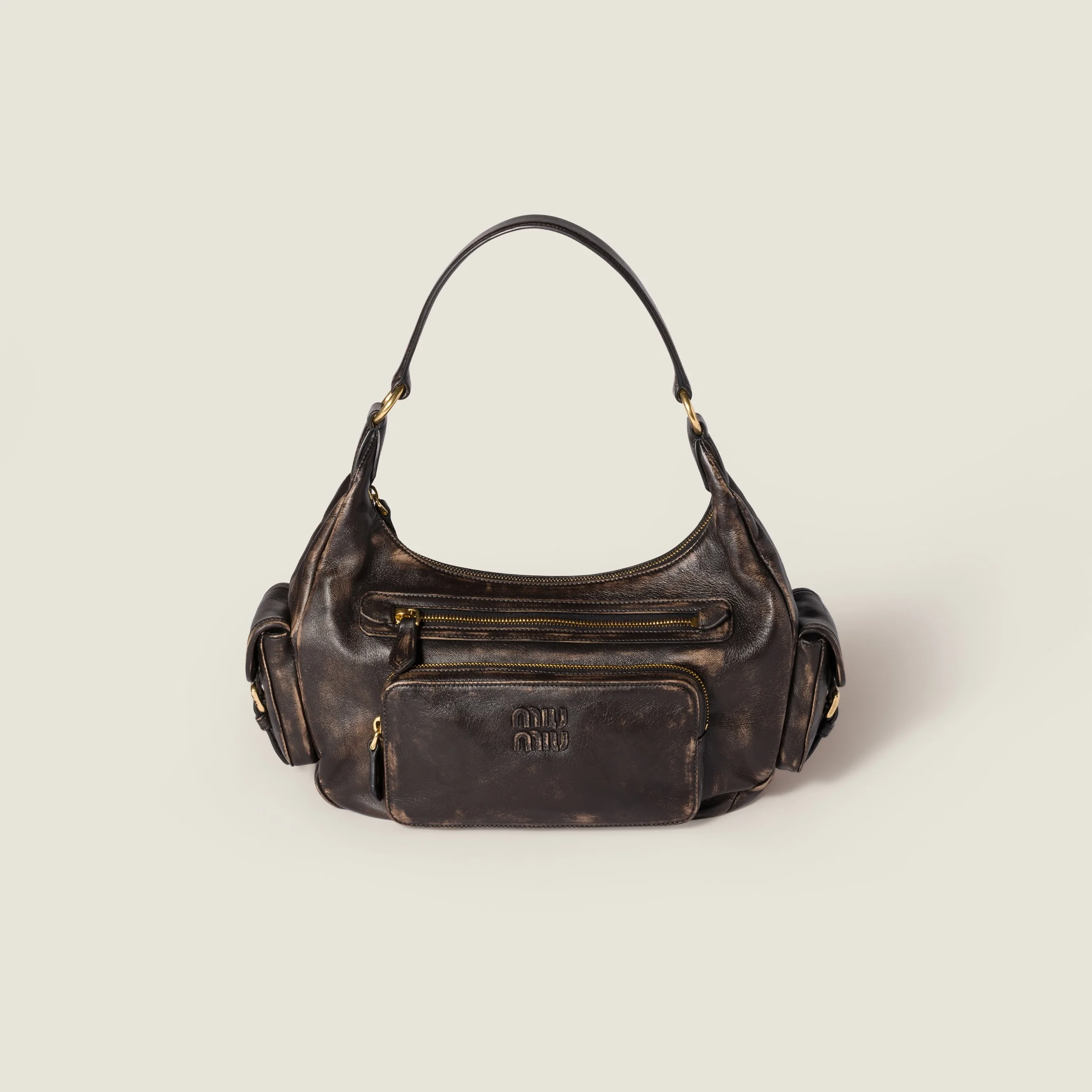 The unmistakable multi-pocket design of the Pocket bag embodies the refined functionality of Miu Miu style. This soft aged nappa version stands out for its new volumes and unique details. - Product code: 5BC189_AF8T_F0201_V_OZO - Nappa leather handle - Gold-tone hardware - Zipper pocket on front and back - Flapped side pockets - Cotton satin lining with zipper pocket - Embossed lettering logo on the pocket - Imported Height 28cm Width 32cm Length 9cm Materials Main material: Lambskin