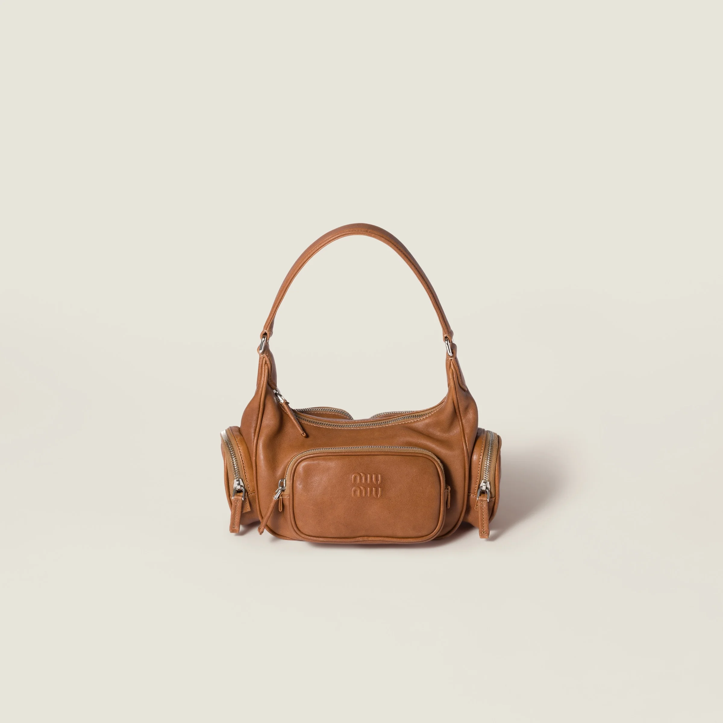 The unmistakable multi-pocket design of the Pocket bag embodies the refined functionality of Miu Miu style. This soft leather version stands out for its new volumes and unique details. - Product code: 5BC188_2CRL_F098L_V_OLT - Washed leather - Leather handle - External zipper pockets - Nappa leather lining with zipper pocket - Steel hardware - Zipper closure - Embossed lettering logo on the front - Imported Height 18.5cm Width 22cm Length 7cm Materials Main material: Lambskin
