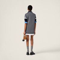 Knitwear meets iconic poplin fabric through a special bonding process, creating this refined yet casual dress that recalls the layering typical of Miu Miu style. - Product code: MF5612_15Q9_F0I13_S_OOO - Straight fit - Short sleeves - Shirt collar - Front button closure - Knit fabric bonded with poplin - Raw-cut hem - Jacquard logo - Imported - The model is 178 cm tall and wears a size 38 Height 83cm Materials Main material: 100% Cotton