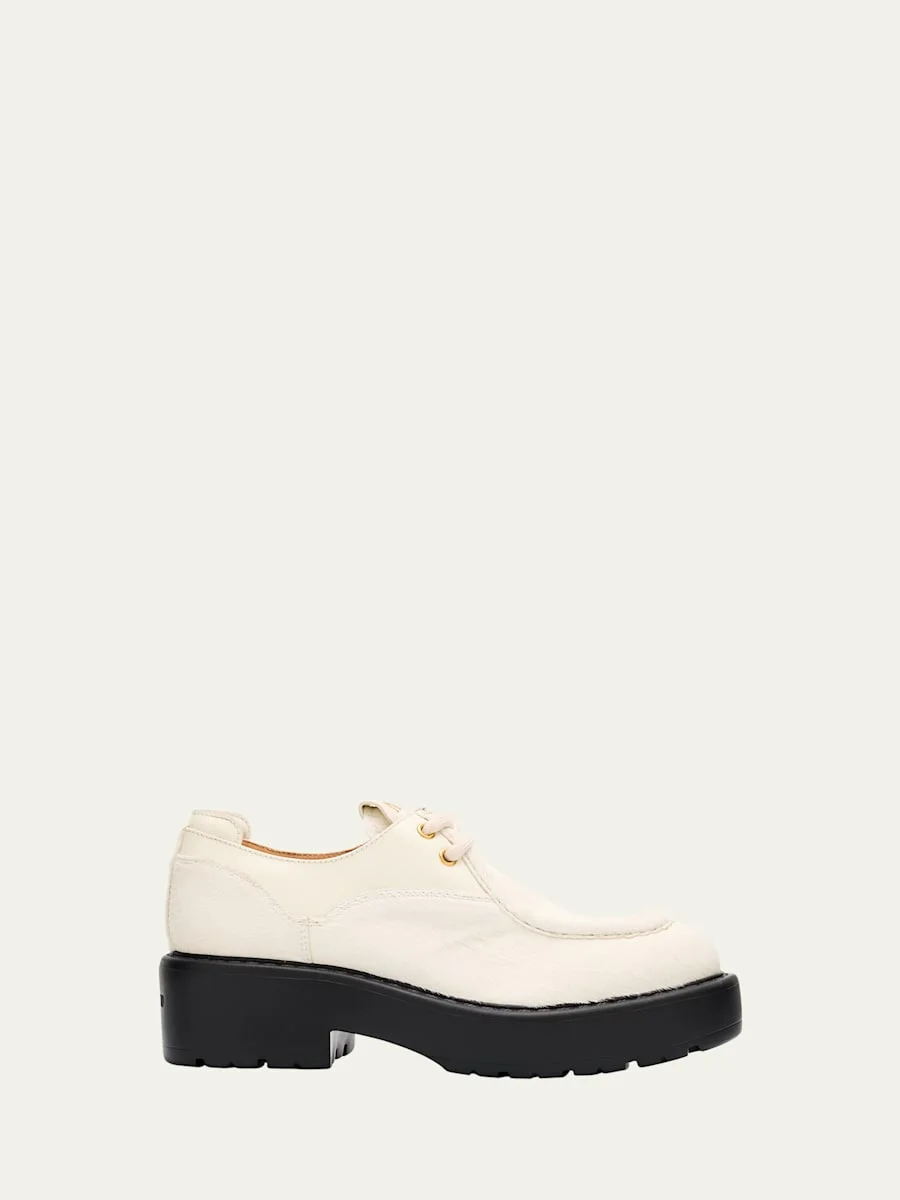 Miu Miu wallabees in dyed calf hair (Italy) and smooth leather 2.25 in / 55 mm block heel Almond apron toe Laceup vamp Slipon style Leather lining Contrasting rubber outsole Made in Italy