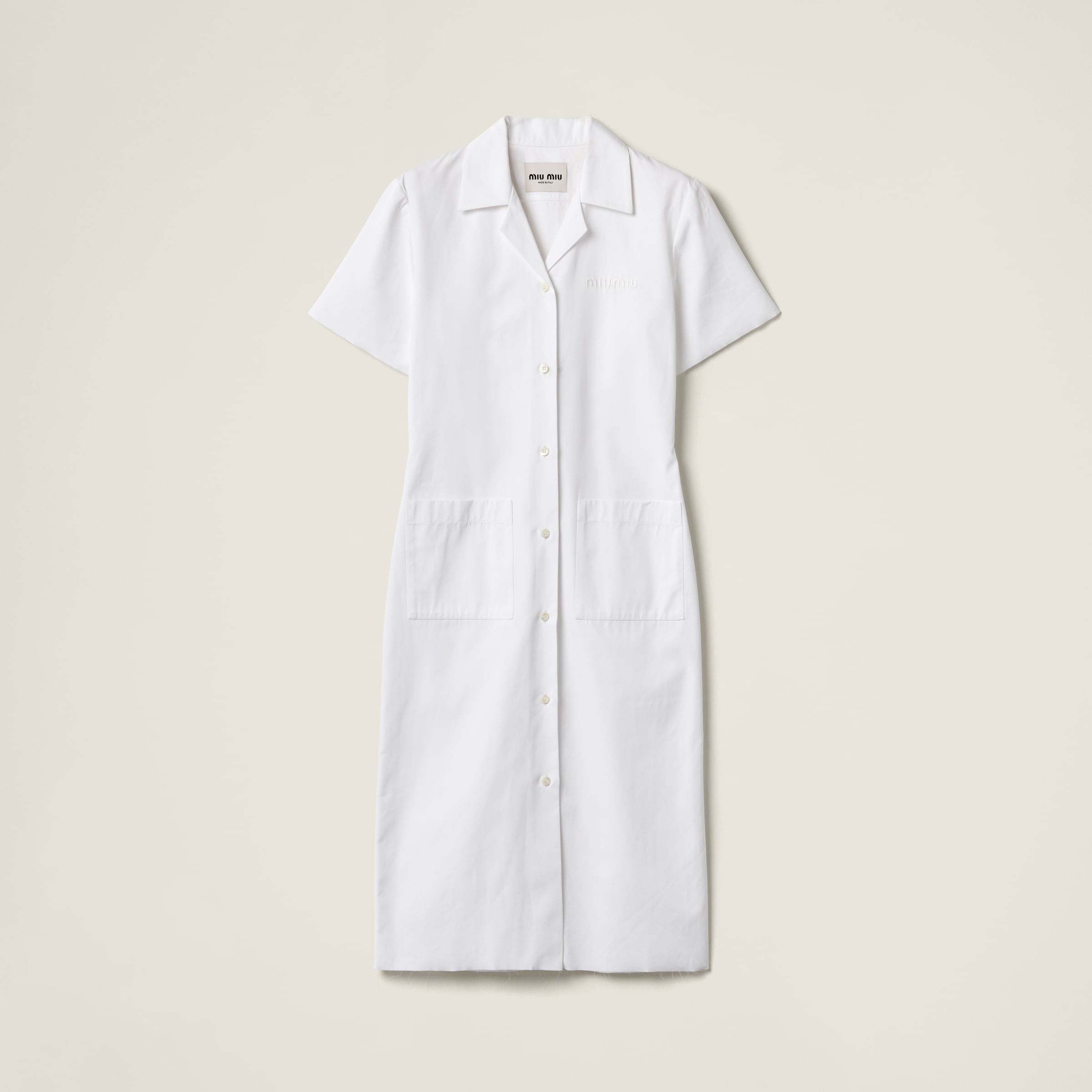 Sleek, minimalist lines characterize this poplin and jersey dress. The embroidered logo adds its iconic signature to the design. - Product code: MF5568_15T9_F0009_S_OOO - Fitted silhouette - Bowling collar - Front button closure - Short sleeves - Patch pockets on the front - Embroidered logo - Raw- cut hem - Poplin fabric bonded with jersey interior - Imported - The model is 177 cm tall and wears a size 38 Height 110cm Materials Main material: 100% Cotton
