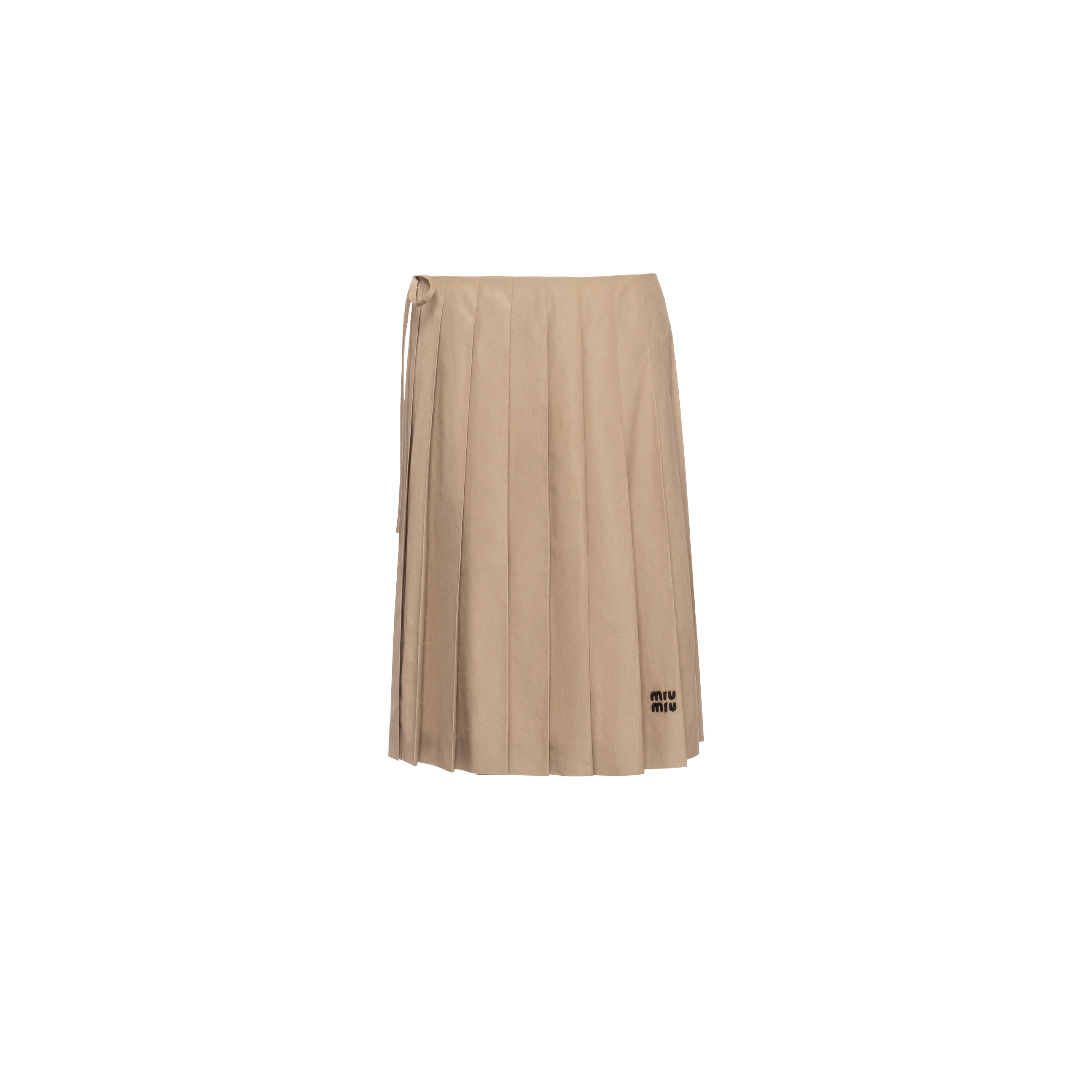 This poplin skirt, seen in the Spring-Summer 2023 show, expresses a notion of fashion as a means of translating a reaction to current reality into material form. Pleating and the side slit create movement on the garment and show how the function of fashion is not just physical but also psychological, able to make an emotional impact. The contrasting embroidered logo stands out on the garment and decorates this new vision of style. - Product code: MG2002_10RG_F0572_S_231 - Pleated silhouette - Unlined - Side slit - Side zipper closure - Embroidered logo - Imported - The model is 181 cm tall and wears a size 38 - Height: 61cm