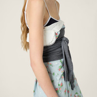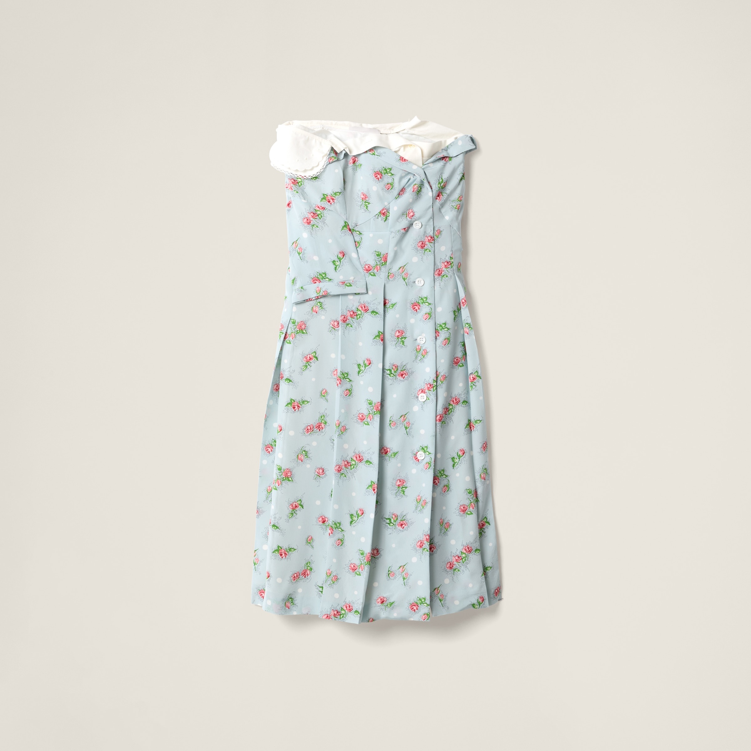 A cheerful rose print adds a special touch to the deconstructed lines of this dress characterized by invisible layering that expresses Miu Miu's bold, experimental essence. - Product code: MF5792_166U_F0ZIJ_S_OOO - «Rose» print - Pleating - Lined garment - Strapless neckline - Front button closure - Imported - The model is 177 cm tall and wears a size 38 Height 112cm Materials Main material: 100% Silk