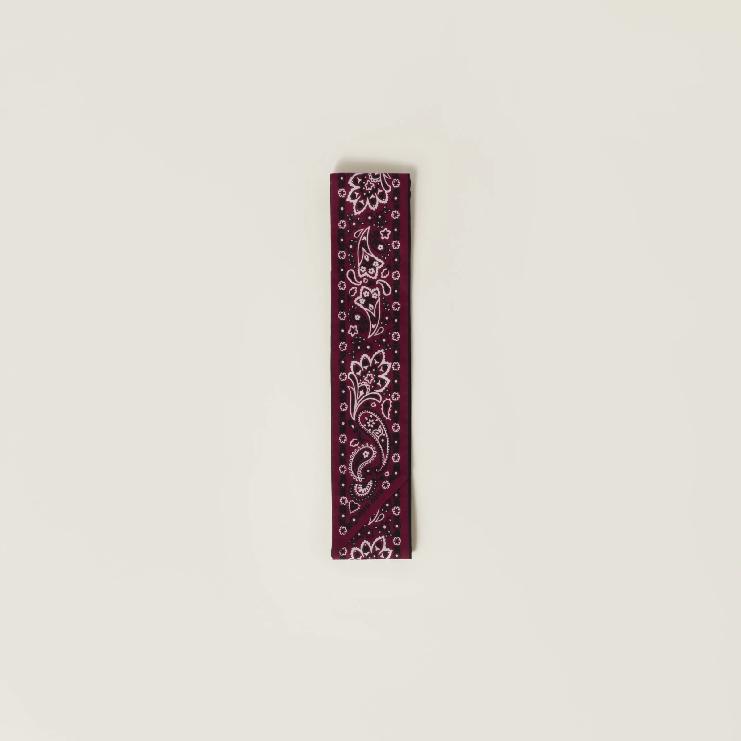 The bandana motif of this poplin scarf, recalling vintage references and distinctive elements of the Miu Miu aesthetic, is characterized by the color contrast that completes each look with a unique touch. - Product code: 5FF008_2ICE_F0399 - Printed logo - Imported Height 85cm Width 6cm Materials Main material: Recycled Polyester