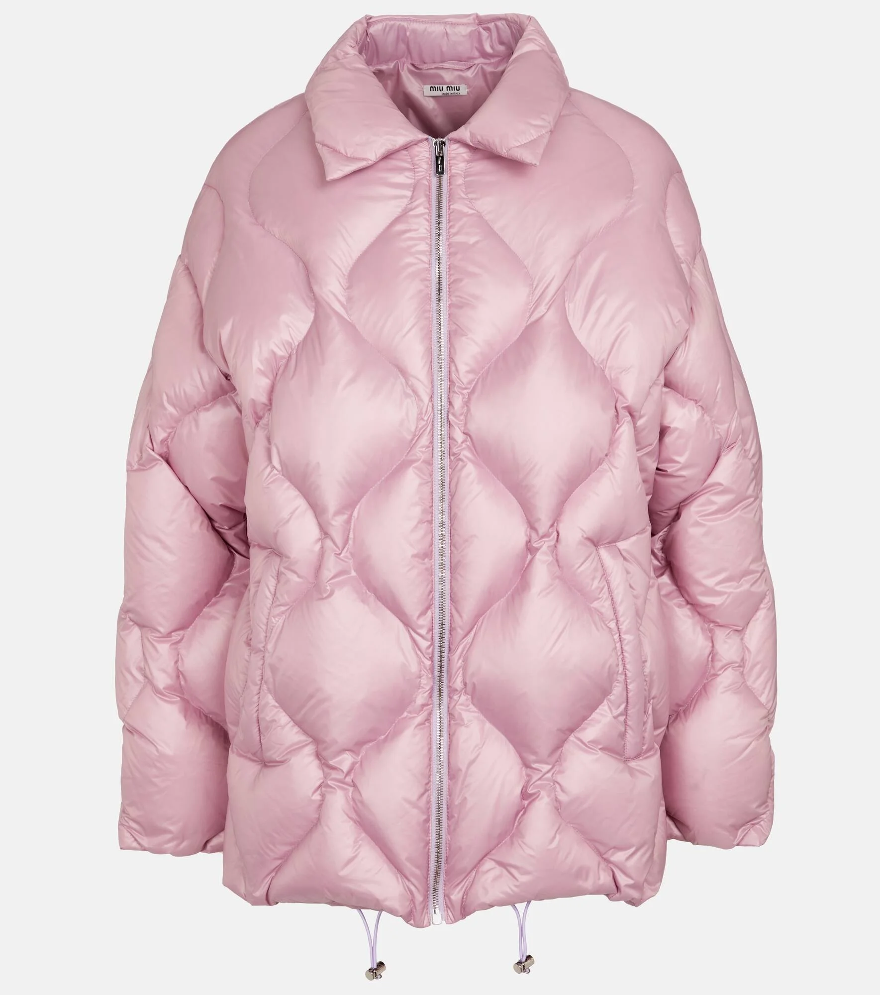 Cozy outdoor styles are at the very top of our wishlist, and this Miu Miu puffer jacket (together with the matching pants) ticks all the boxes. With its powder-pink matelasse-quilted outer and pillow-soft down fill, it balances style and function just perfectly. Product Details - Made in Italy - Drawstring at the hem for adjustable fit - Filling: 90% down, 10% feathers - Designer color name: Alabastro - Material: 100% polyamide - Lining: 100% polyamide, fully lined - Closure: zipped front - Care instructions: dry clean - Pockets: zipped pockets - Item number: P00594933 Size & Fit - Fits large to size - we recommend trying one size smaller - Dropped shoulders - Falls below the hip - The model seen in the picture is 178cm-5'10" and wearing a size IT 38