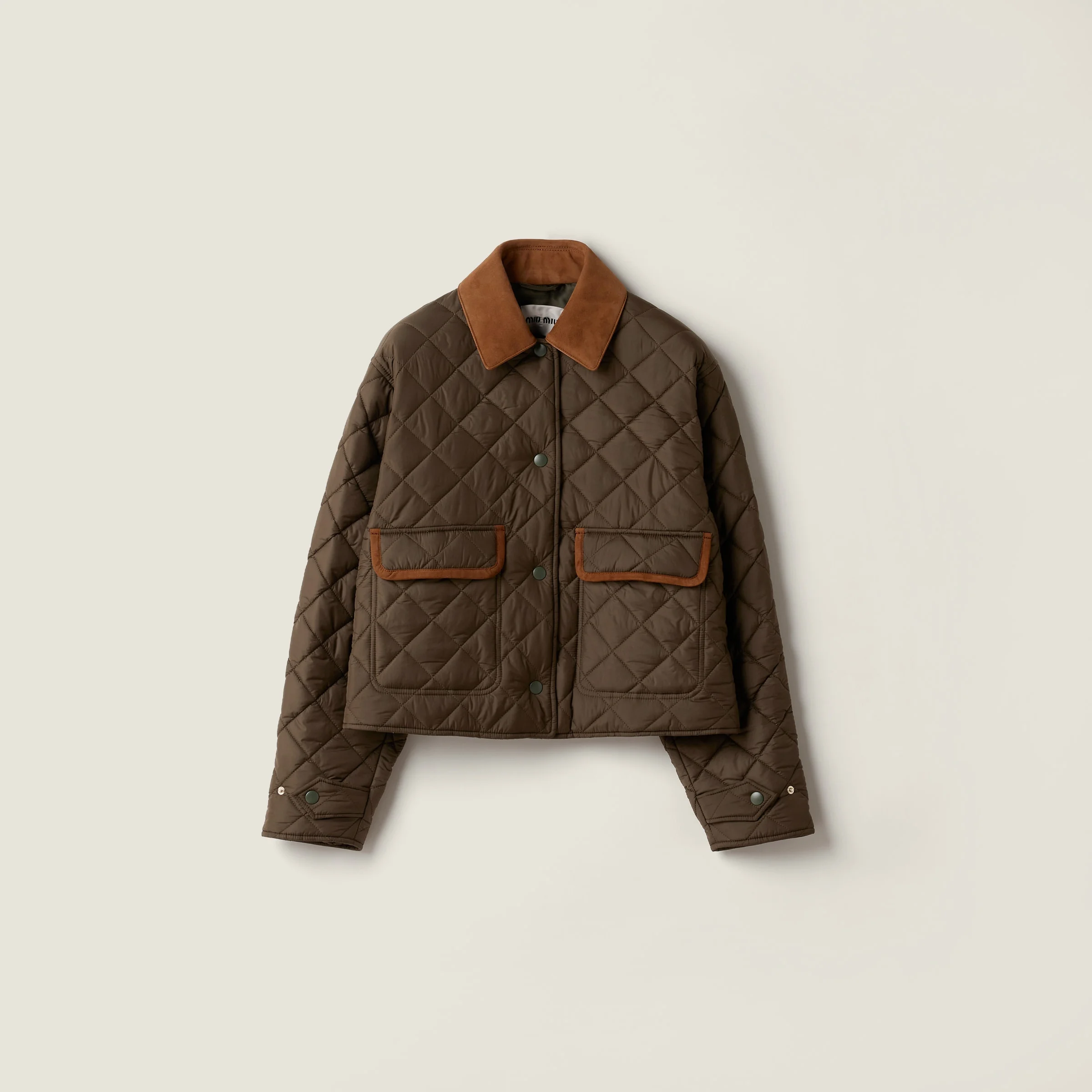 This blouson jacket, a reinterpretation of the classic quilted puffer jacket, stands out for its light weight and the softness of the boxy fit, in harmony with the colors and textures of the understated suede and nappa leather details. - Product code: ML1310_17OO_F0161_S_OOO - Unlined garment - Leather collar - Button closure - Side slits - Cuff with buttons for double adjustment - Patch pockets - Leather details - Embroidered logo - Imported - The model is 178 cm tall and wears a size 38 Height 56cm Materials Main material: 100% Recycled Polyester