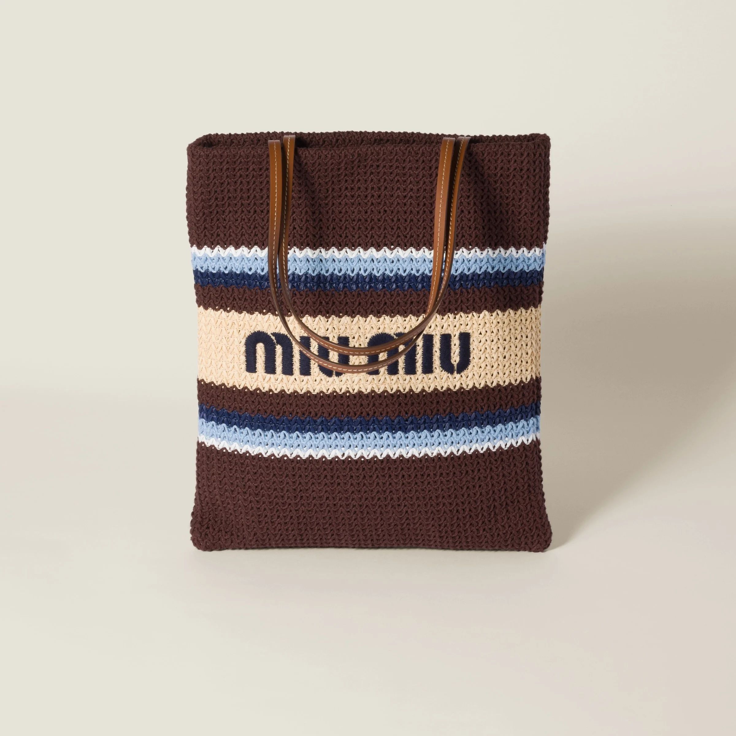 This fascinating and versatile bag stands out for the raffia effect and particularly colorful woven motif that forms the distinctive Miu Miu logo, enhancing its summery essence and unique character. - Product code: 5BG248_2DO3_F04EM_V_OR1 - Leather handles - Gold-tone hardware - Drill interior with zipper pocket - Embroidered logo on the front - Imported Height 41cm Width 32cm Materials Main material: Cotton Polyester Viscose