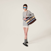 This fascinating and versatile bag stands out for the raffia effect and particularly colorful woven motif that forms the distinctive Miu Miu logo, enhancing its summery essence and unique character. - Product code: 5BG228_2DO3_F04EM_V_OO1 - Leather handles - Gold-tone hardware - Drill interior with zipper pocket - Embroidered logo on the front - Imported Height 34cm Width 40cm Length 16cm Materials Main material: Cotton Polyester Viscose