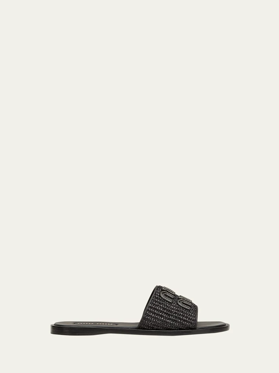 Miu Miu woven raffia sandals with leather trim 0.17 in / 5 mm flat heel Open toe Wide band upper with logo lettering Slide style Leather outsole Lining: Leather Made in Italy Online Inquiries: BGS21_X6GJ2| Store Inquiries: #4699534