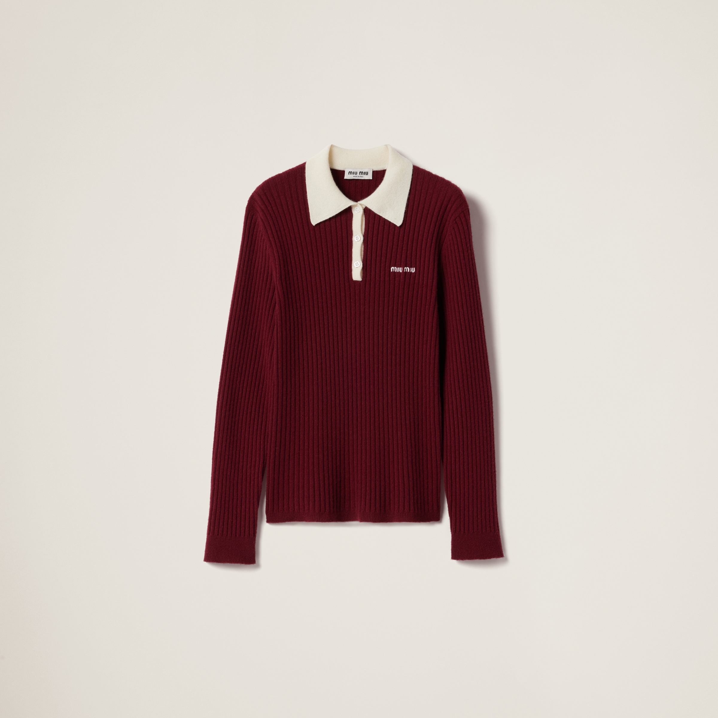 The tennis inspiration blends with preppy elements in this cashmere long-sleeved polo shirt. The essential lines are enriched with ribbed motif and contrasting colors in a classic garment with a versatile, contemporary touch. - Product code: MMLA35_1580_F038I_S_OOO - Long sleeves - Ribbed motif - Straight fit - Ribbed knit collar - Semi-raglan shoulder - Ribbed knit cuffs and hem - Three-button front closure - Embroidered logo - Imported - The model is 178 cm tall and wears a size 38 Height 65cm Materials Main material: 100% Cashmere