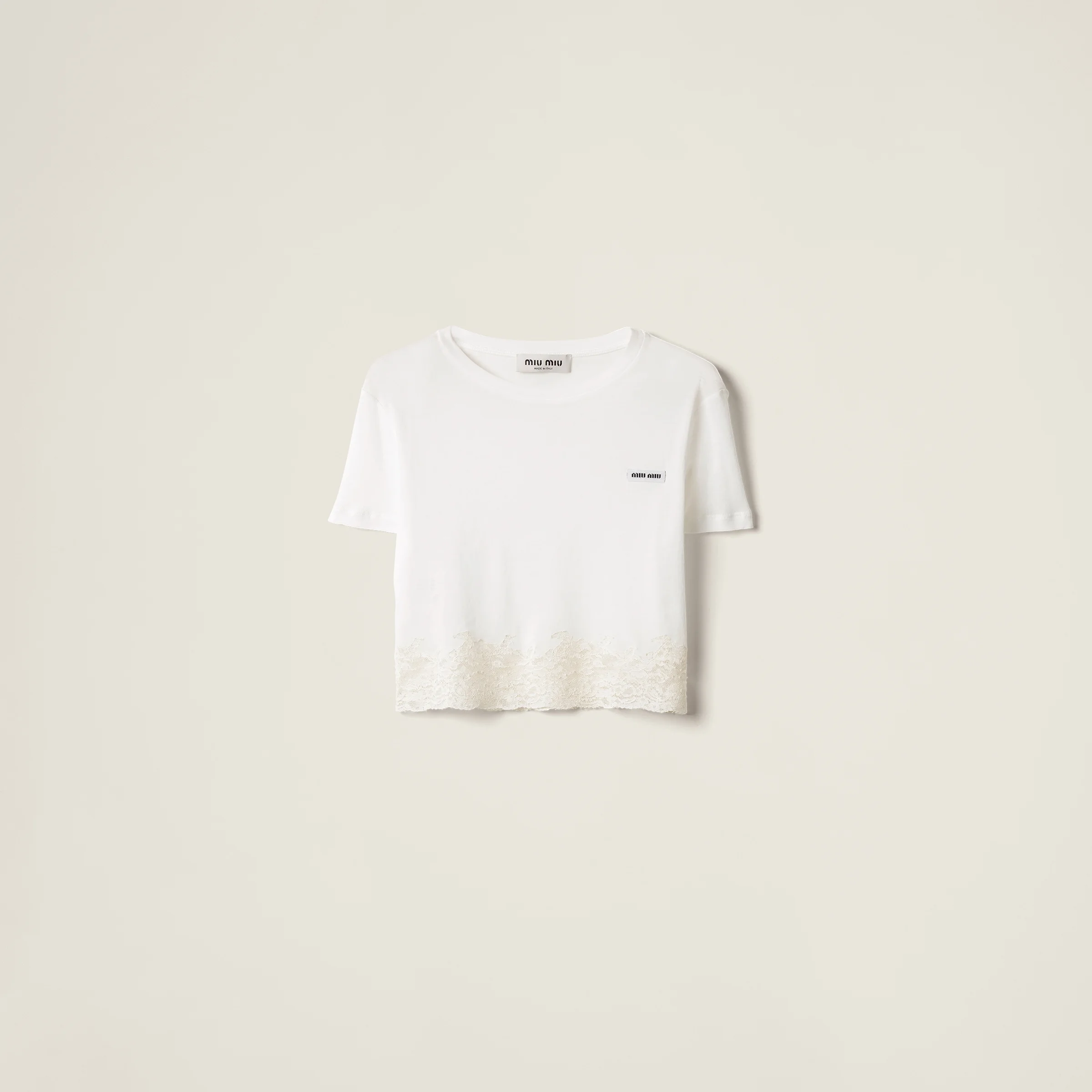 Fascinating references to lingerie accentuates the lines of this ribbed jersey tee embellished with sophisticated lace details that highlight its elegance and uniqueness. - Product code: MT2155_16J0_F0009_S_OOO - Unlined garment - Crew-neck - Short sleeves - Lace-trimmed hem - Logo patch - Imported Materials Main material: 100% Cotton