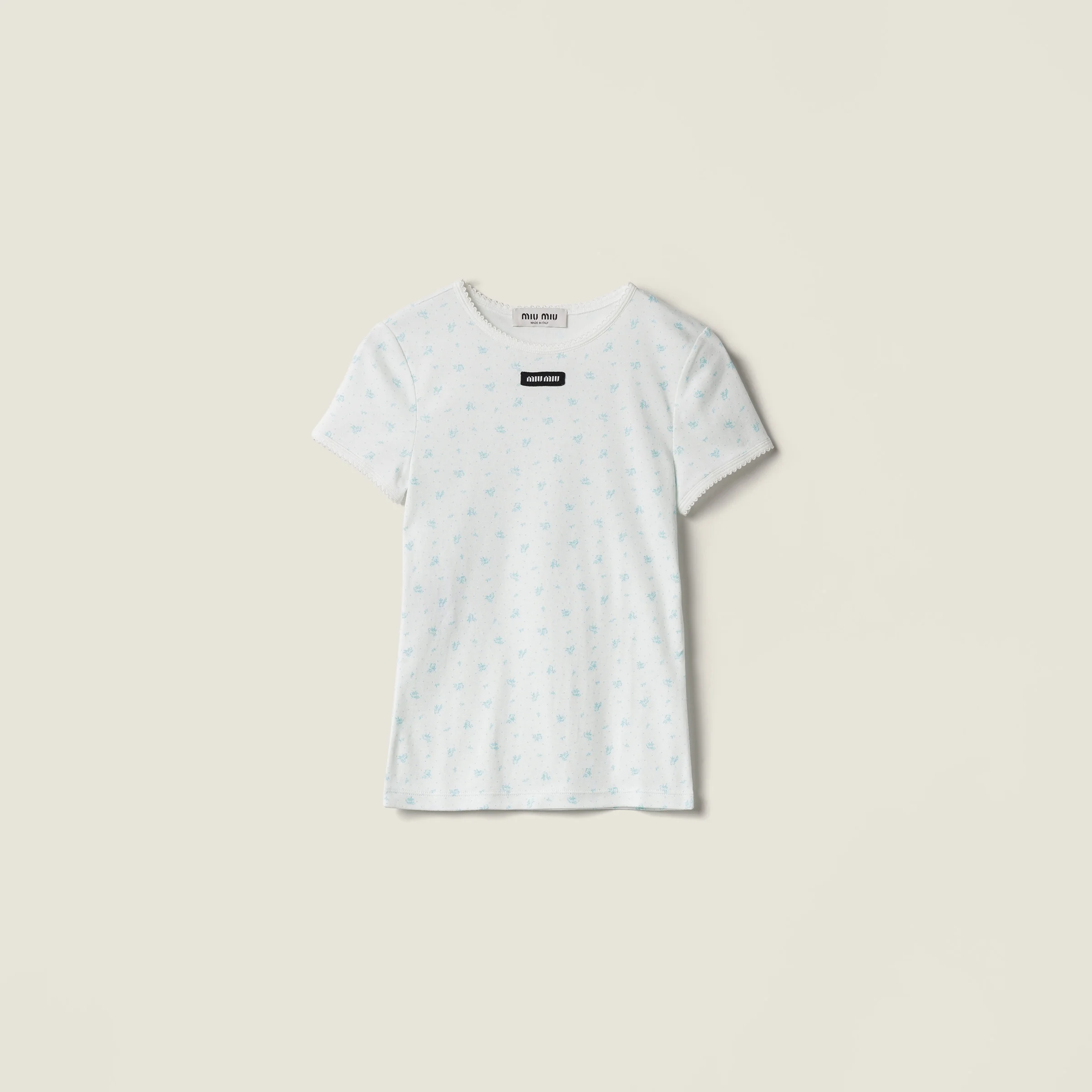 The very fine ribbed knit jersey of this tee recalls a preppy aesthetic and is enriched by a refined floral motif and discreet embroidery, ideal for the playful layered looks typical of Miu Miu style. - Product code: MJNA08_18ZU_F0AZ1_S_OOO - «Flowers» print - Straight print - Short sleeves - Crew neck - Twin-needle hem - Logo patch - Imported - The model is 178 cm tall and wears a size 38 Height 45cm Materials Main material: 100% Cotton