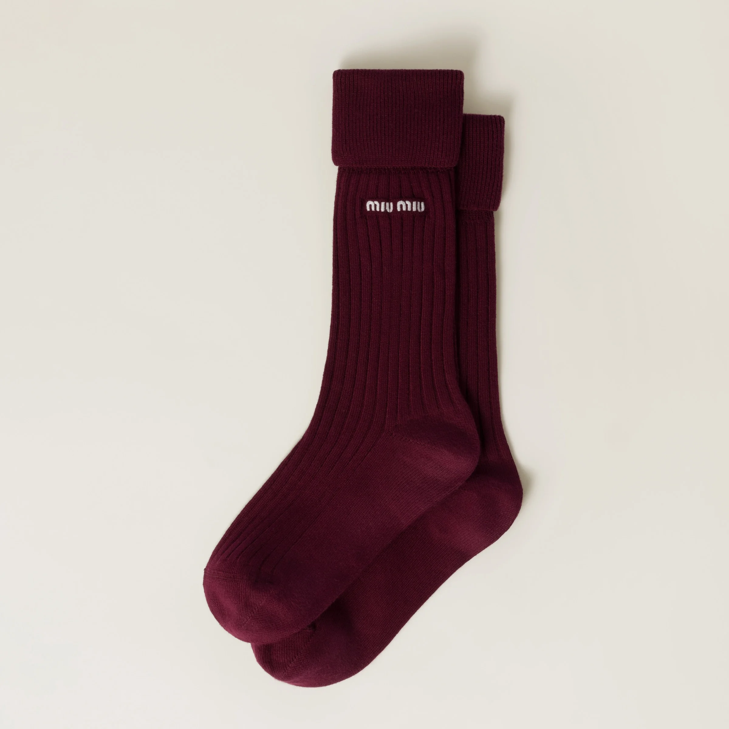 Miu Miu's iconic and vintage spirit emerges through the ribbed knit and embroidered logo on these cotton socks, perfect for completing versatile, unique looks. - Product code: MCZ491_16JW_F0399_S_OOO - Ribbed knit - Embroidered logo - Imported - The model is 178 cm tall and wears a size 38 Materials Main material: 100% Cotton