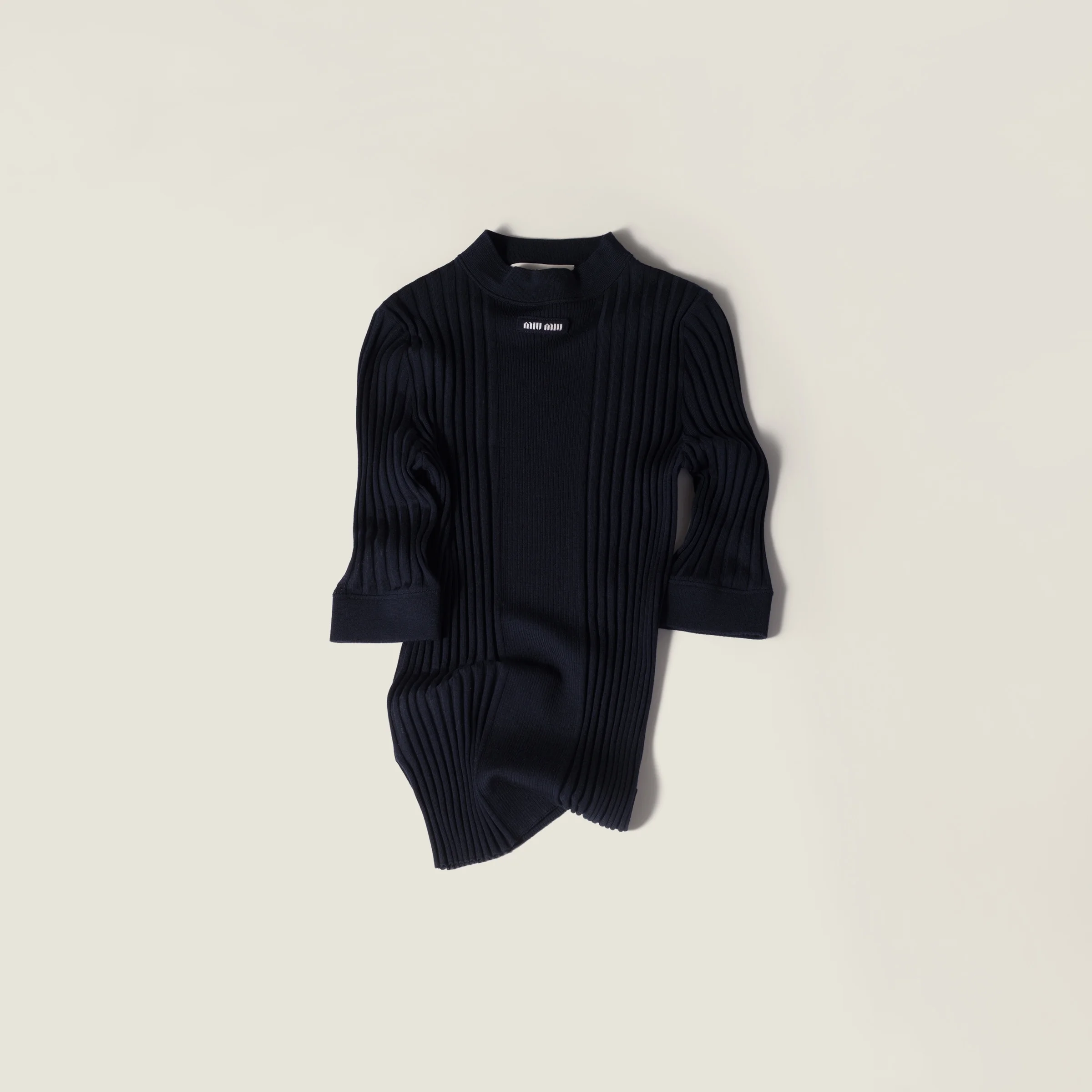 Very fine wool yarn enhances the ribbed knit motif of this sweater that harmoniously expands from the center towards the sides, revealing Miu Miu's sophisticated artisan craftsmanship and experimental spirit. - Product code: MML02L_18TW_F0008_S_OOO - Ribbed knit - Slim-fit silhouette - Three-quarter sleeves - Ribbed knit mock turtleneck - Semi-raglan shoulder - Ribbed knit cuffs - Knit logo patch - Imported Height 58cm Materials Main material: 100% Virgin Wool