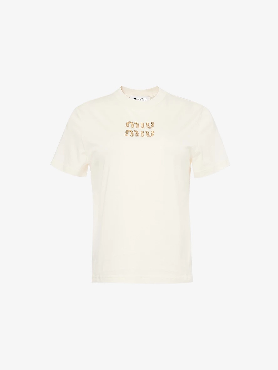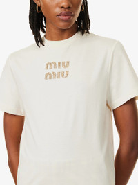 PRODUCT DETAILS - Miu Miu cotton-jersey T-shirt - 100% cotton - Slips on - Regular fit, round neckline, ribbed trim at neck, short sleeves, embellished branding at chest - Specialist dry clean - True to size - Model is 5ft 10in/1.78m and wears a size small - Lightweight, slight stretch Ref: R04405897