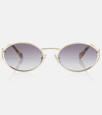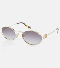 Sun-shielding style made easy, these Miu Miu sunglasses are shaped with rounded frames with logo detailing at the temples. This golden pair is finished with tinted lenses and tortoiseshell trims at the arms. Product Details - Frame material: metal - Frame color: gold - Lens filter category 2 - Lens color: black - Made in Italy - Includes: case and presentation box, cleaning cloth - The color of the case may vary - Item number: P00813199 Size & Fit - Lens width: 54mm-2.15" - Bridge size: 21mm-0.85" - Earpiece length: 125mm-4.9"