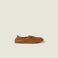 The elegant lightness of the Miu Miu loafer is expressed in this suede version available in intense shades that enhance the versatile line and distinctive ruched detail. - Product code: 5D341E_008_F0316_F_D005 - Upper with leather band - Leather lining - Leather insole - Rubber sole - Logo embossed on the tongue and screen-printed on the insole - Imported Materials Main material: Lambskin
