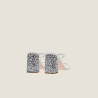 A chunky heel decorated with a sparkling cloud of glitter characterizes these lustrous satin sandals. This ultra-feminine, modern shoe is defined by the simple two-band upper that enhances the silhouette of the foot. - Product code: 5XX589_3APE_F0J36_F_085 - Fabric logo label - Leather sole - 85 mm glitter-covered heel - Imported