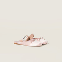 The timeless silhouette of the Miu Miu ballerina flat is reinterpreted in this summery mule style enriched with lustrous satin and the iconic logo detail. - Product code: 5F451E_QU6_F0615_F_005 - Upper with bow and elastic strap with logo - Leather sole - Screen-printed logo on the insole - Imported Materials Main material: Silk Viscose