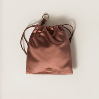 This practical, functional pouch is characterized by the smooth texture of satin, the drawstring closure, and the metal Miu Miu logo in a contrasting shade. - Product code: 5NG010_049_F0324 - With snap-hook - Leather strap - Leather drawstring closure - Metal lettering logo - Satin lining - Imported Height 21cm Width 18cm Materials Main material: Silk Viscose