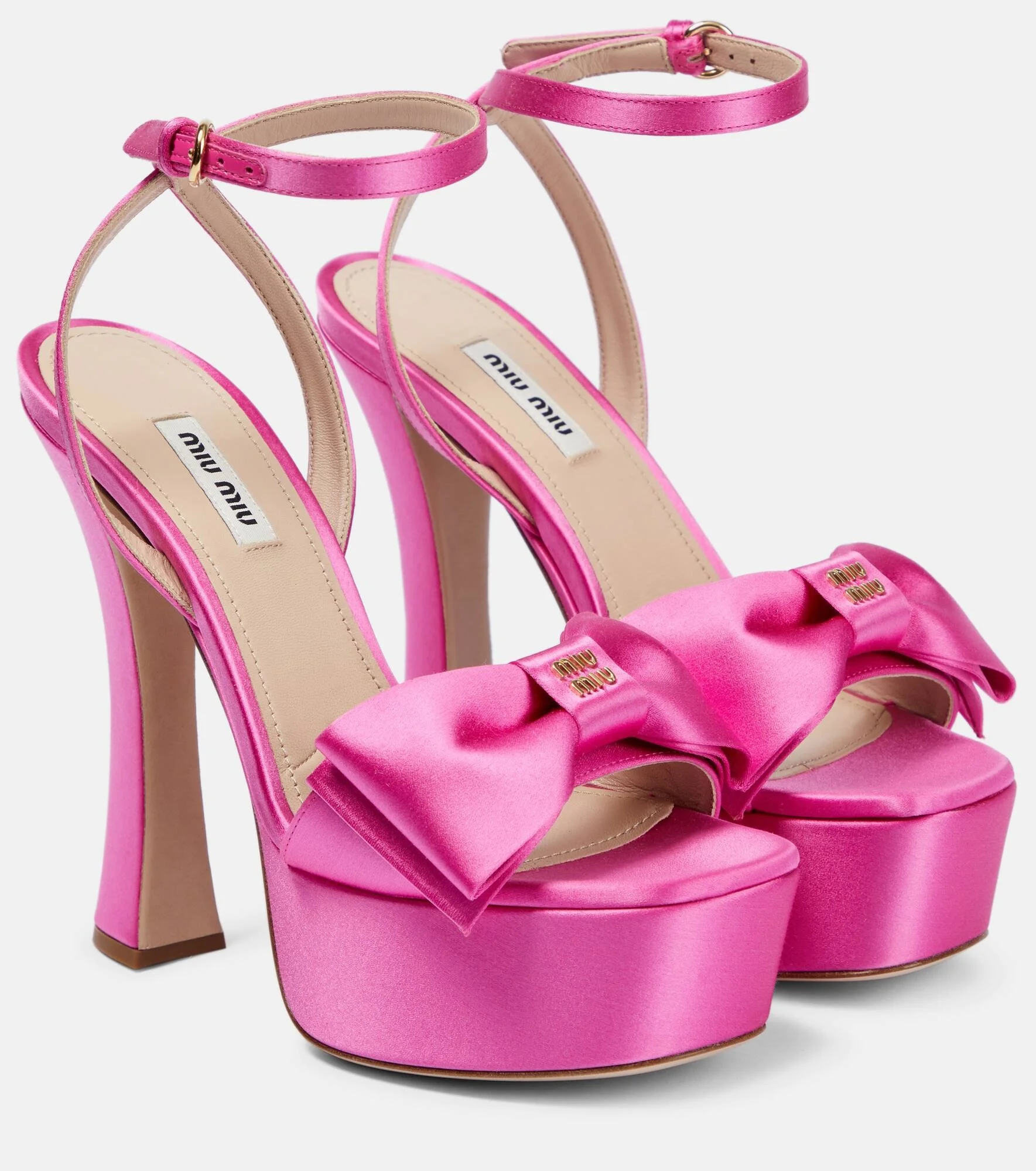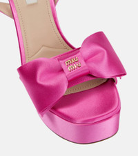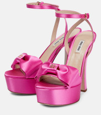 Make every step a glamorous one with these platform sandals from Miu Miu. Made in Italy from lustrous satin, they have thin ankle straps and bow embellishments at the toe straps. Product Details - Lining: leather - Upper: fabric - Sole: leather insole, leather and rubber sole - Comes with a box - Toe shape: square open toe - Designer color name: Begonia - Closure: buckle-fastening ankle strap - Made in Italy - Item number: P00720776 Size & Fit - True to size - European sizes - 15cm-6" heel (size EU 38) - 4,5cm-2" platform (size EU 38)