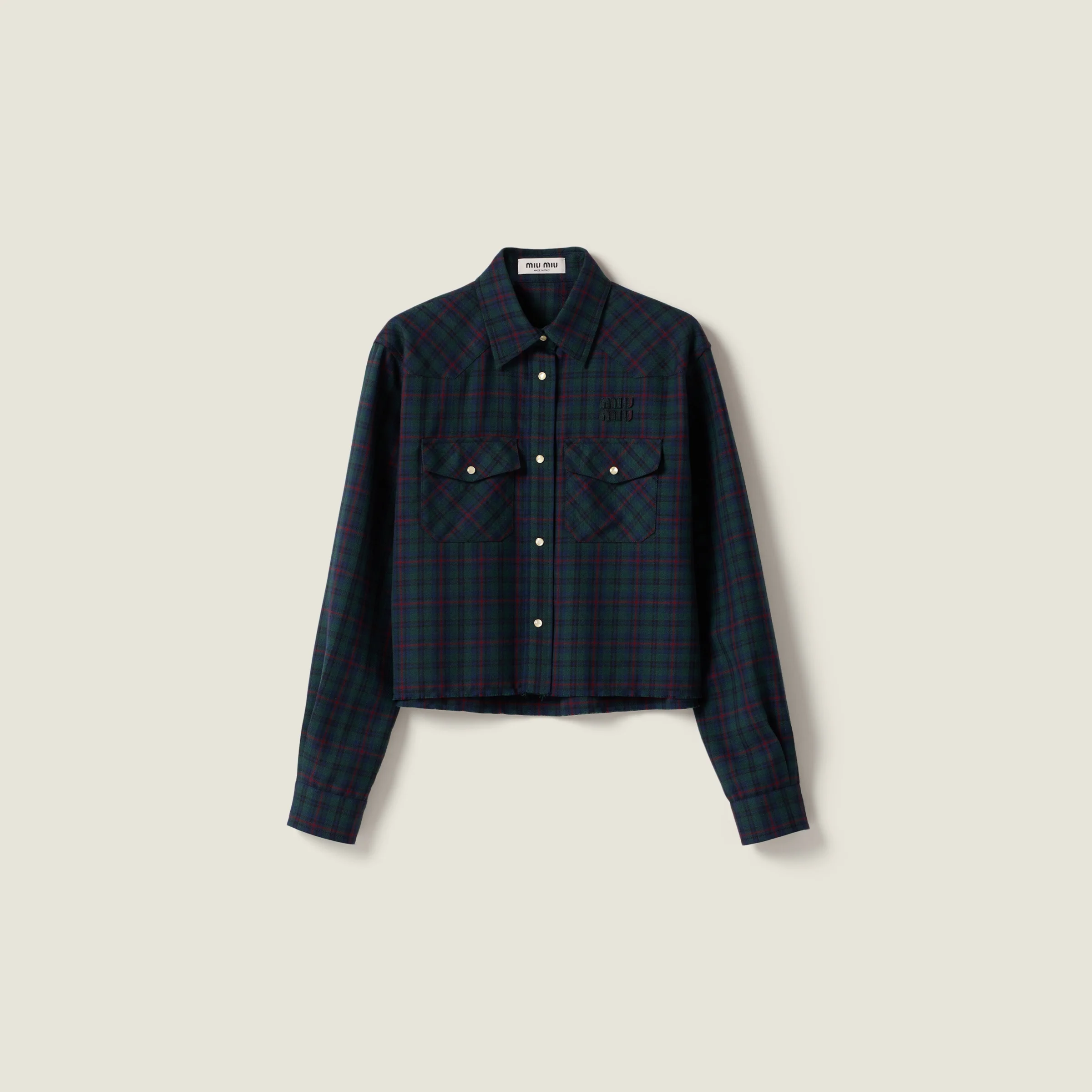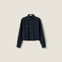 This shirt reflects Miu Miu's experimentation with menswear: The plaid pattern with a vintage mood, the boxy fit, and the embroidered tonal lettering logo define the iconic, contemporary identity. - Product code: MK1970_174R_F0D3Z_S_OOO - Cropped fit - Shirt collar - Front snap closure - Front pockets - Sleeves with shirt cuffs - Lettering logo - Imported - The model is 180 cm tall and wears a size 38 Height 53cm Materials Main material: 100% Virgin Wool