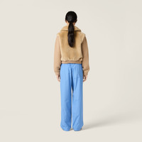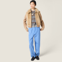 The soft elegance of the shearling paired with Shetland wool and cashmere knitwear reflects the craftsmanship of the Miu Miu wardrobe. Harmonious volumes come together with contemporary details interpreting the essence of an elegant, cozy garment. - Product code: MPV963_177S_F0040_S_OOO - Regular fit - Lined garment - Shirt-style collar - Front zipper closure - Knit sleeves with ribbed knit cuffs - Wide welt pockets - Ribbed knit hem - Hot-stamped logo - Imported - The model is 176 cm tall and wears a size 38 Materials Main material: Lambskin