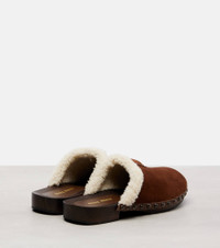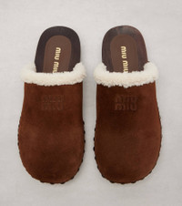 Uninhibited, carefree, and deliberately subversive: these are the hallmarks of Miuccia Prada’s Miu Miu. Complete with plush shearling lining, these clogs are made in Italy from brown suede. Product Details - Upper: calf leather (suede) - Lining: shearling - Sole: wooden insole, rubber sole - Toe shape: round toe - Made in Italy - Includes: shoe box, dust bag - Designer color name: Cacao - Item color: brown - Trim: shearling - Item number: P01075448 Size & Fit - Fits large to size - we recommend trying one size smaller - Half sizes please take the next size down - European sizes - 4cm-1.5" heel (size EU 38) - 2,5cm-1" platform (size EU 38)