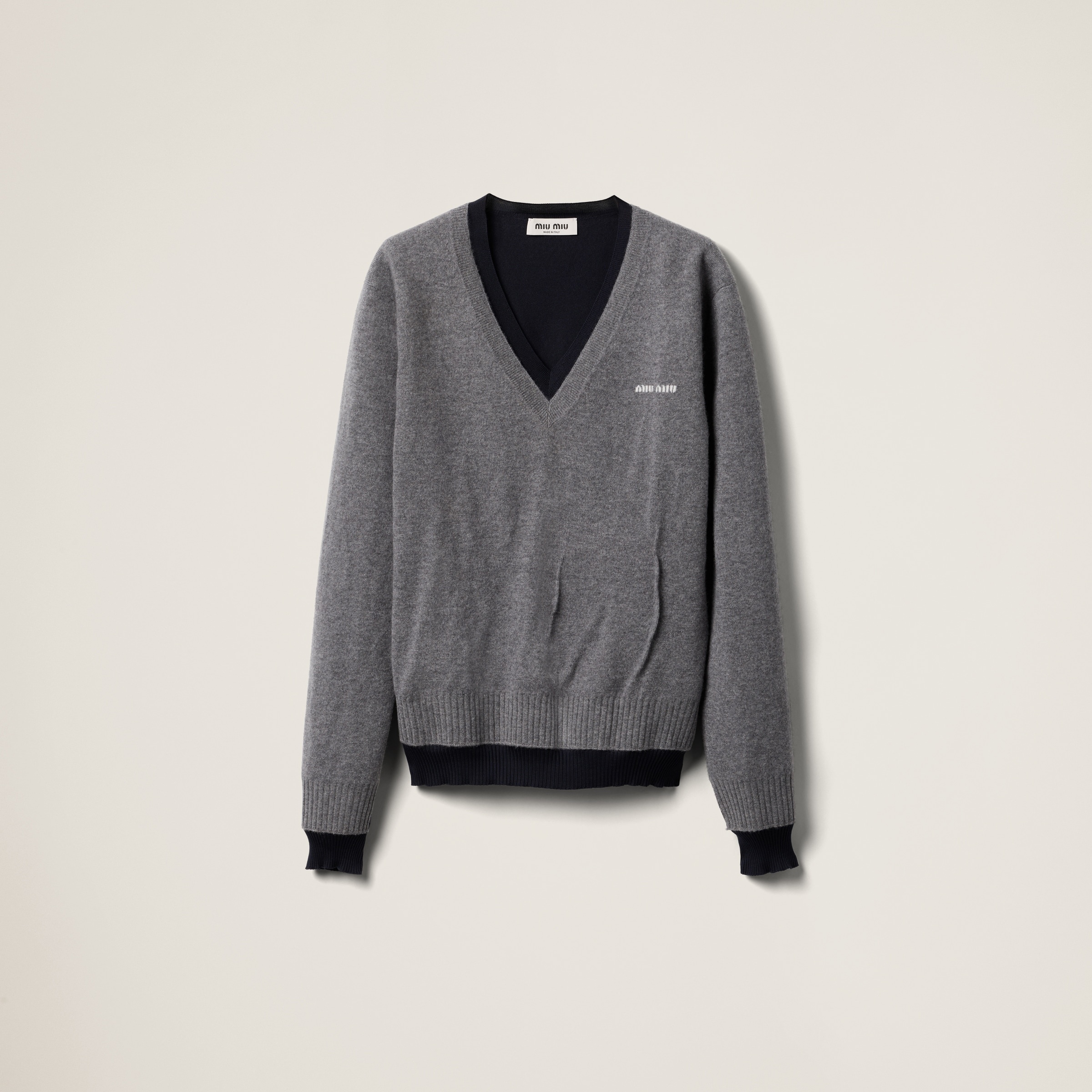 This menswear-inspired V-neck sweater is made from cashmere and silk with a classic cut, accented with contrasting trims. - Product code: MML994_15RK_F0MZQ_S_OOO - Long sleeves - Shaved motif - Over fit - V-neck - English shoulder - Ribbed knit at cuffs and hem - Inlay logo - Two-part design - The upper part is cashmere and the lower part silk. - Imported - The model is 178 cm tall and wears a size 38 Height 64cm Materials Main material: 100% Cashmere