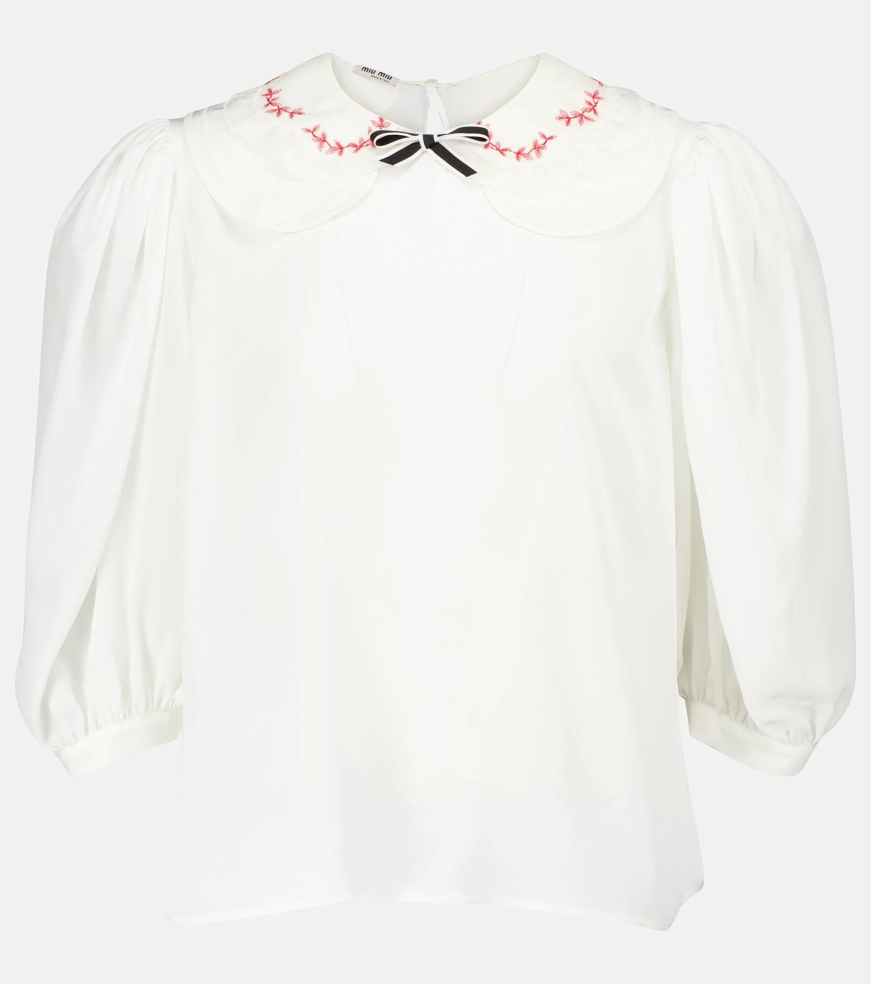A delicately scalloped collar with a pretty bow detail infuses this top with Miu Miu's eclectic take on feminine style. Made from silk crepe de chine, it has a unique silhouette with a relaxed fit through the bodice and puffed three-quarter sleeves. The pure white colorway grounds the style in versatility, so wear it with miniskirts and jeans alike. Product Details - Material II: 100% cotton - Made in Italy - Buttoned cuffs - Designer color name: Talco - Closure: buttoned back - Material: 100% silk - Care instructions: dry clean - Item number: P00528383 Size & Fit - True to size - Oversized shoulders - Semi-sheer - Designed for a loose fit - Falls below the hip - The model seen in the picture is 178cm-5'10" and wearing a size IT 40