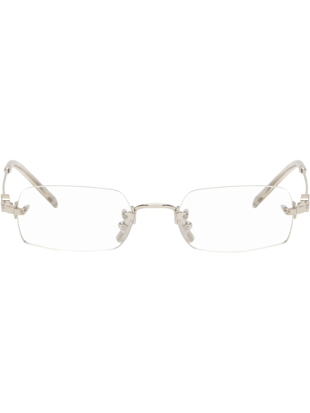 Rectangular rimless metal-frame optical glasses. · Adjustable rubber nose pads · Logo hardware at temples · Acetate temple tips · Includes case · Size: 50.20 140 Supplier color: Silver Metal, acetate. Made in Italy 261209F004004